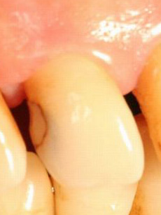 セメントを除去したところ。二次カリエス(むし歯の再発)になり、茶色く変色しています。 |