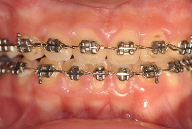上下前4歯にブラケットという小さな装置を歯の表面に取り付け、ワイヤーを通して少しずつ歯を移動させます。 |